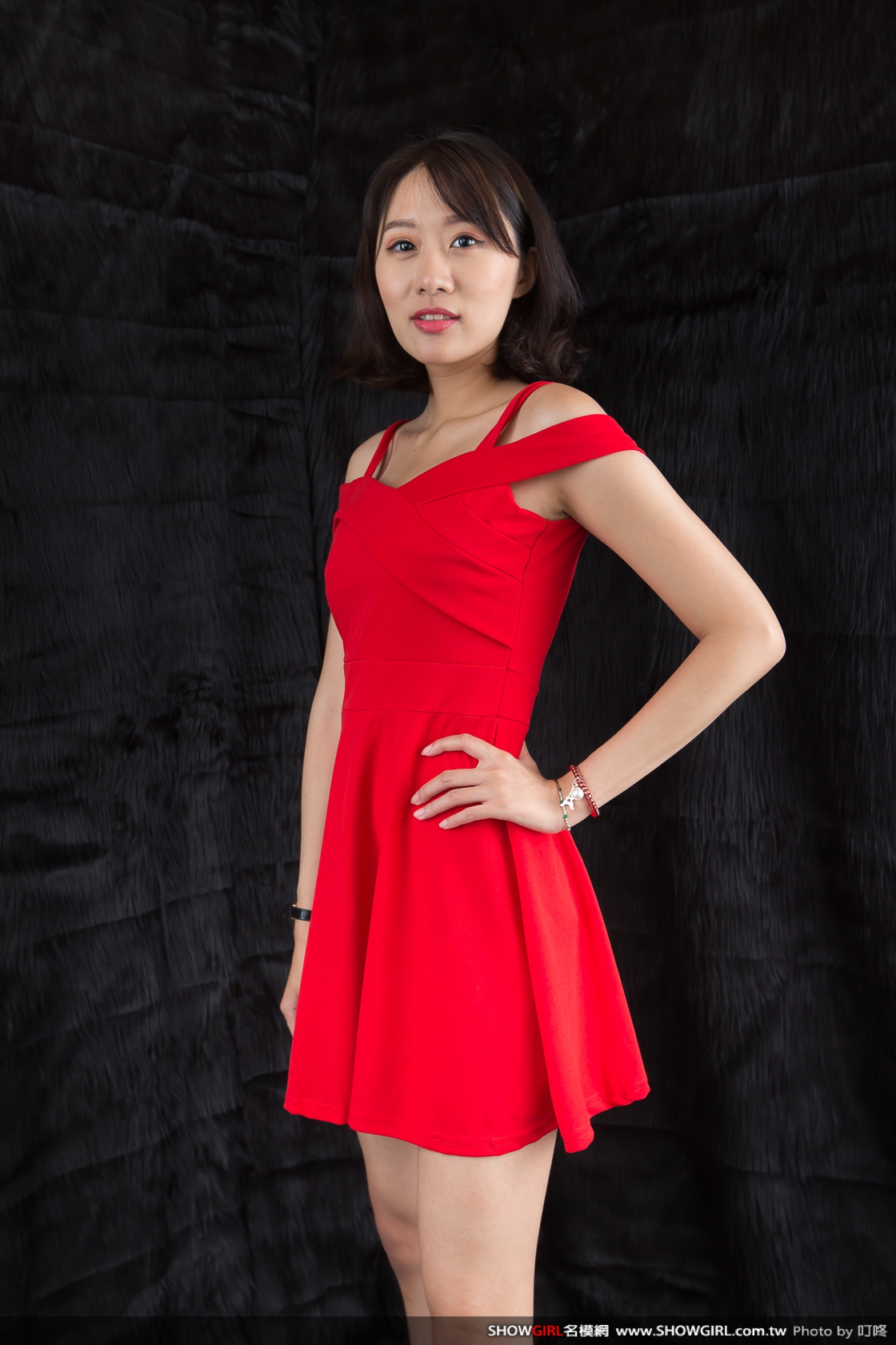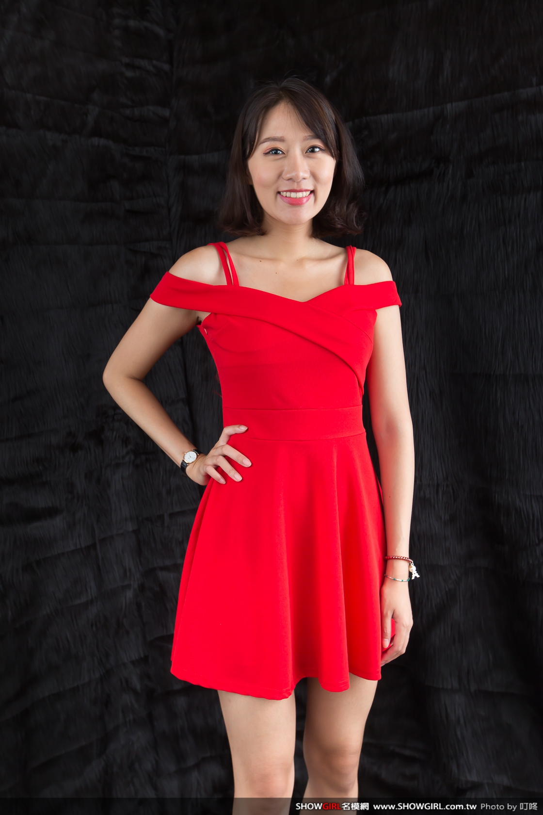 紅色大器的小禮服,肩帶的設計方式有很多變化組合,肩上的細帶子可以收起變成側邊的平口造型。