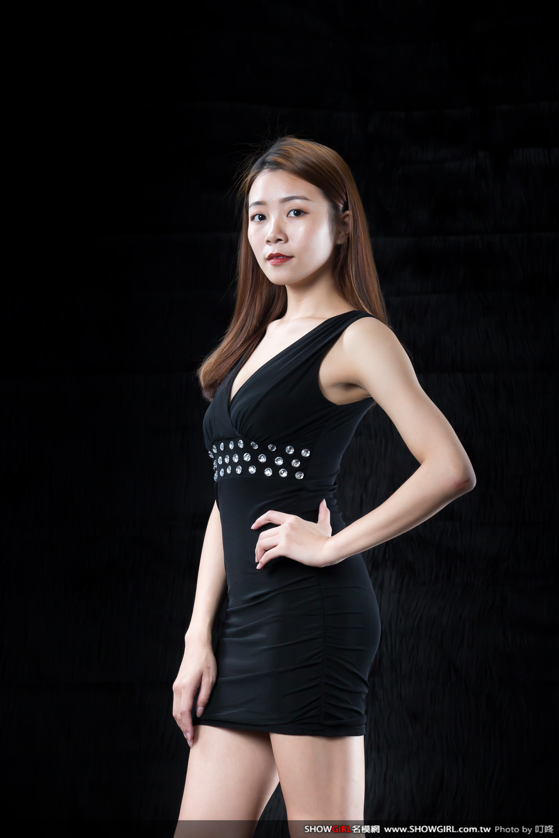 這套是以黑色雪紡紗布製成的小禮服,簡單俐落的雙肩設計搭配胸前深V的開口,讓小模可以突顯事業線的性感風情。